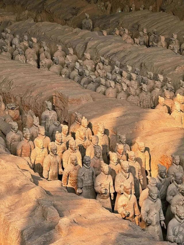 一号坑最大,兵俑一排排的,望不到头。大部分是灰的,偶尔能看到残留的彩绘,一抹朱红,一点石绿。他们表情都不一样,有的严肃,有的好像还有点迷茫。有个跪射俑,铠甲上的鱼鳞纹刻得清清楚楚,鞋底的针脚都看得见。站在坑边,能闻见一股淡淡的、两千年前的土腥味。