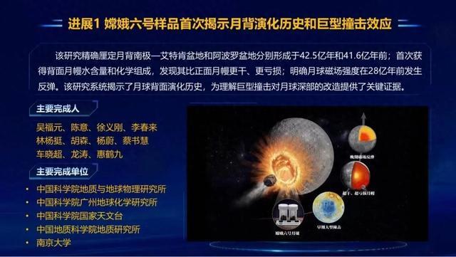 ——识别出撞击成因新型月球岩石,精准限定月球最大撞击盆地(SPA盆地)及内部阿波罗盆地的形成时间,分别为42.5亿年前和41.6亿年前,为月球早期撞击历史研究提供关键时间标尺;