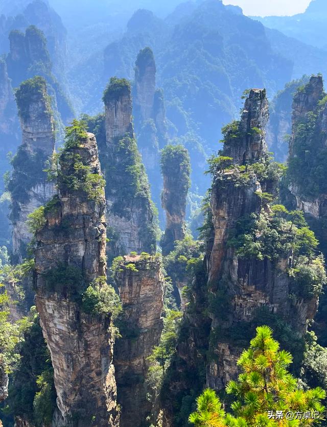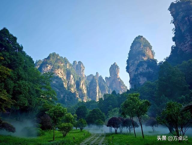 景色:春日里,石英砂岩峰林间长满新绿,云雾缭绕,像走进了仙境,《阿凡达》里的“哈利路亚山”原型就在这;