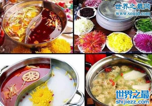 传说由慈禧太后首创的菊花火锅,一听名字还未吃就能感觉到它的优雅和清新,菊花火锅的味道不但清香鲜美而且具有药膳作用,能清热、平肝和明目。在火锅中加入鸡汤或其他肉汤的汤汁,煮沸后将鸡片、肉片、鱼片等等生料投入,然后再放入菊花瓣,煮熟即可食用。
