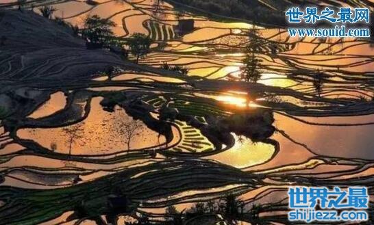 当太阳呈逆光角度驱散晨雾,层层梯田便渐渐染上金光,坐落其间的哈尼族彝族山寨,被云雾掩映得扑朔迷离,如诗如画,如梦如幻。在斜阳和彩霞的映照下,连片的梯田就像是浩瀚的大海,雄伟壮丽,各种有节奏的层次和美妙曲线,五彩斑斓的颜色搭配,常让人目瞪口呆,不知身在何处。