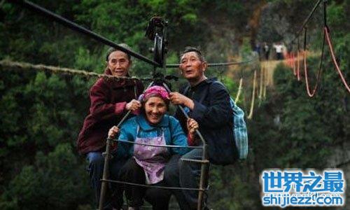 2001年,红德村搭起了第一根铁索。自此,村里人路过这条“断头路”时,直接坐溜索。除了搭溜索,村民们还有一个选择,就是裂缝底部的一座竹竿桥。村民出行往往先从村子这边下到谷底,通过竹竿桥,再爬上对岸。因为两边全是约90度的陡坡,这一下一上至少会花掉村民们至少2个小时的时间。