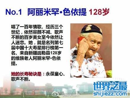 唱了一百年情歌、经历三个世纪,依然容颜不减、歌声不断的百岁美女至今依然让人迷恋。她,就是名列第七届中国十大寿星排行榜第一名,来自新疆疏勒县:128岁的维族老人阿丽米罕·色依提,号称中国最长寿的人。