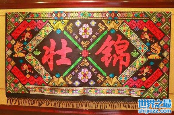 壮锦是广西壮族自治区的一种传统丝织品,产生于宋代,以棉纱或麻纱股线为经,以蚕桑丝为纬,也会将丝线染色绣制花样,色彩斑斓,对比强烈,具有粗犷的艺术风格,独具特色。