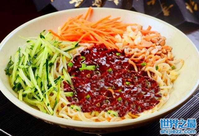 老北京炸酱面是一道传统的中式面食,由菜码、炸酱拌面条而成,流行于北京 、天津、河北等地。主食材是面条,酱料主要以干黄酱和甜面酱为主,配菜就比较灵活,是当地很有特色的美食。
