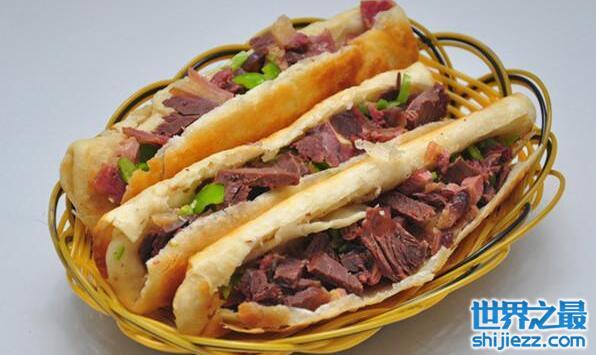 驴肉火烧历史悠久,在明朝时就已经声明远播。驴肉以20种调料烹煮,色泽鲜嫩、香而不柴,火烧酥脆多层,二者结合在一起:外脆内软、肥而不腻、浓香诱人、回味醇厚。
