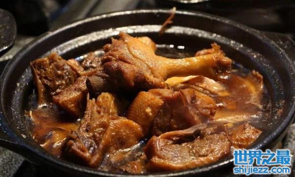 厦门姜母鸭以红面番鸭为原料,用芝麻油将鸭肉炒香后,再加入老姜(姜母)及米酒等炖煮而成。成菜味道鲜香,甘辛兼备,且具有疏肝润肺、养胃健脾、舒筋活血、祛寒化痰等功效。