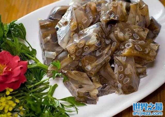 土笋冻是用海产的“笋”加工烹制的冻品,特点是鲜嫩清脆、晶莹剔透、凉喉爽口,是厦门地区的风味名点。吃土笋冻的时候,要蘸点芥辣椒酱、芝麻酱、乌醋、蒜绒、调味酱油等,才能吃出它的风味。
