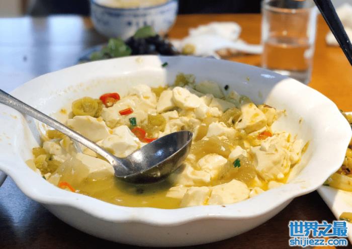 烂松菜滚豆腐是金华汤溪的地方特色名菜。所采用的原料,是当地种植的黄豆用手工制成的豆腐,并用当地种植的厚大白菜腌的松菜,味道又臭,又香,很下饭,不吃不知道,一吃忘不掉!不过总被外地小伙伴们质疑“这玩意儿也能吃?作为游客,如果你来到汤溪,可以点上一份烂松菜滚豆腐,尝尝它的味道。