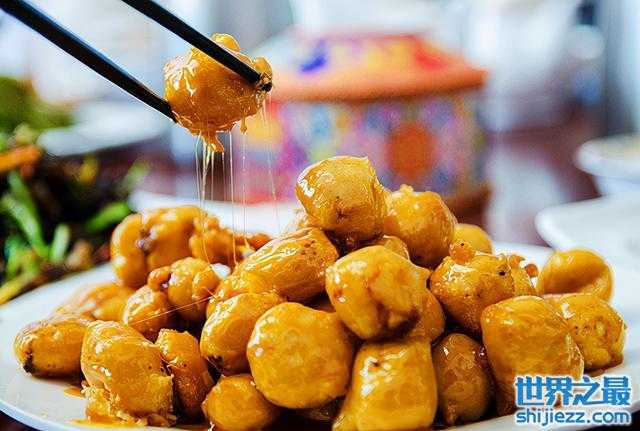 拔丝奶豆腐也是内蒙古特有的风味菜,主要以奶豆腐为主料制成。拔丝食品很常见,但奶豆腐却是内蒙古居民特有的奶食品,奶豆腐不是豆腐,而是一种奶制品,经过发酵后,形似豆腐状。拔丝奶豆腐口味香甜,形似千丝万缕,口味香甜,是酒席饭桌上的上等佳品。