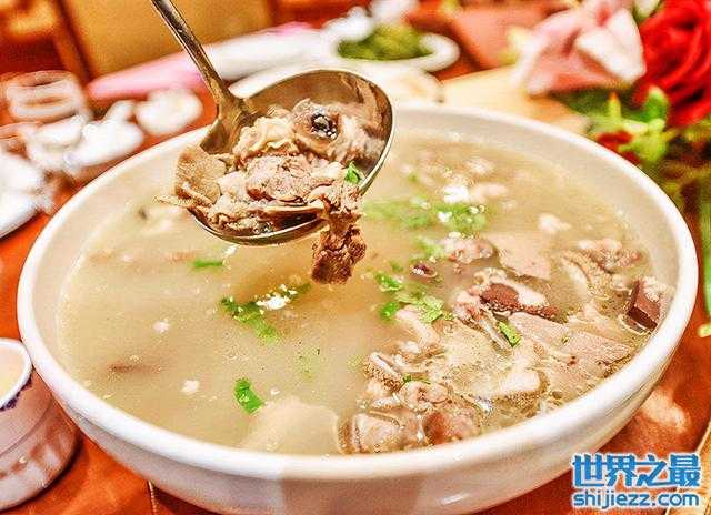 内蒙古全羊汤也是内蒙古最有风味的汤,主要材料有羊肚、羊肝、羊肺、羊肠等,将这些羊下水煮好,切碎,再加入羊骨头一起煮汤。所以,这道菜也称为羊杂碎汤。全羊汤呈白色,口味鲜,香辣浓醇,一点也不膻,深受喜爱,特别是寒冷的冬天,来一碗全羊汤,全身都暖了。