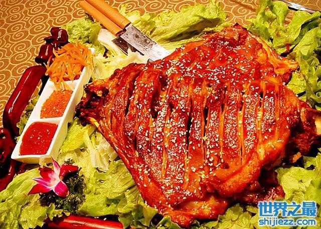 烤羊腿是草原人招待贵宾的一道名菜,主要原料便是羊后腿、番茄酱和芹菜等。烤羊腿也是由烤全羊演变而来,相传,也是成吉思汗喜爱的名菜。烤羊腿与烤全羊不同,分量小,做起来也更方便,整只羊腿形状美观,颜色鲜亮,肉质嫩,口感酥香,不腻也不膻,非常美味。
