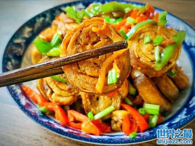 臭豆腐卷是河南的特产,特别是信阳人最爱吃这道菜。臭豆腐卷是用臭豆腐、腐皮、猪肉、花生粉等一起制作而成,上面长满了一层白绒绒的毛,闻起来奇臭无比。在河南,一把小葱,一根臭豆腐卷,一起下锅炒一炒就是一道家常美味,一盘臭豆腐卷能吃几碗饭。