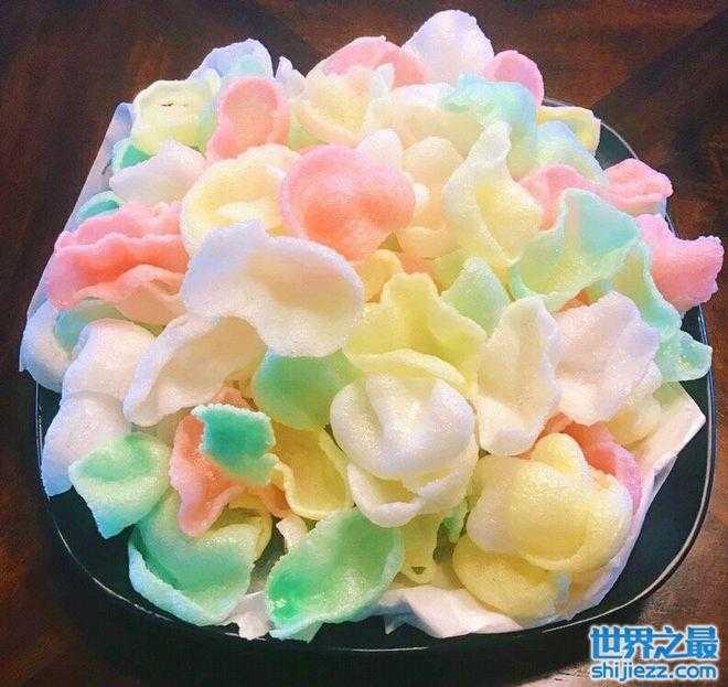 炸虾片又称薯片虾片,是一种广受欢迎的大连传统小吃。据了解虾片用虾肉汁加淀粉制成的,配料表中还有白砂糖、食用盐和色素类的食品添加剂,是一种可以DIY的膨化食品,经过油炸就膨化成很大一块炸虾片,冷却之后很脆很香,很蓬很松脆!