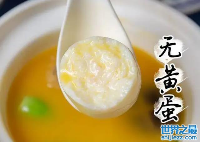 这款菜肴是湖南省的十大经典名菜之一,它在制作工艺上颇为考究,之所以称之为“无黄蛋”,并不是因为此蛋本身没有蛋黄,而是需要大厨把蛋清蛋黄分离,然后经过特殊调味方式,在保留蛋壳圆形的状态之下,注入调味好蛋清,蒸煮凝固成型。之后的烹饪手法和一般的清炖手艺差不多,融入当地特产花菇的风味,辅以菜心的点缀加成,清鲜味美,风格特异,相对于无黄蛋来说,醇白的蛋香质感让人印象深刻。