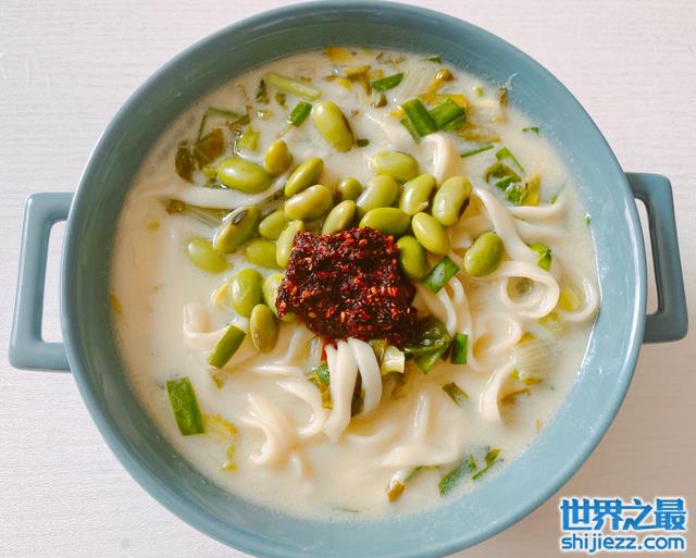 浆面条是河南省洛阳市的特色小吃,酸酸的味道真的特别好吃。浆水是做绿豆凉粉剩下的绿豆浆发酵得来的,锅里倒一斤酸浆水煮开下三人份的面条,吃的时候用调好的胡萝卜丝、芹菜末、煮面的黄豆,浇上稀释的芝麻酱和炸熟的花生碎即可。