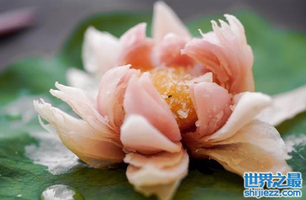 荷花酥是浙江杭州的一道著名传统小吃,该美食起源于明清时期,是一种宫廷点心,做出来的点心形似荷花,酥层清晰,看着形美动人,吃着酥松香甜,别有风味。