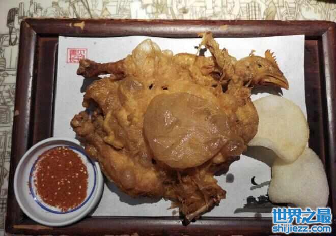 葫芦鸡是陕西的特色名菜之一,被誉为:长安第一味。也是非常容易翻车的一道菜,很检验厨师的功力,整鸡裹面粉炸制而成,远观似一大肚葫芦,据说制作程序颇为复杂,先水煮,然后蒸,再油炸,皮酥肉烂,筷到脱骨,才能实现皮脆肉嫩、鲜香细腻的绝妙口感,再配一小碟秦椒辣子,真叫一个美味!