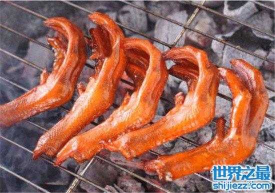 烤鸭掌,这道菜已经被列为中国十大禁菜之一,做法超级残忍将铁板烧热之后,将一只活生生的鸭子放在上面,他由于感到疼痛便会不断地挣扎,最后直到它的脚掌被烤熟之后,便残忍地剁下来。这道菜几乎没有人敢享用,因为想想那血腥的场面,不会再忍心品尝了。