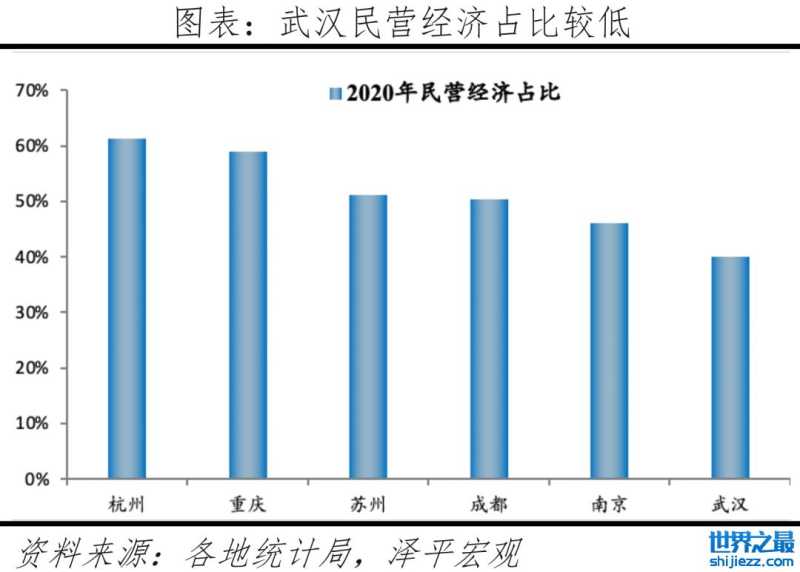 武汉民营经济占比相对较低,民营经济活力不足,近年武汉不断优化营商环境。武汉是传统的工业重镇,以武钢、东风汽车等为代表的国企是武汉的经济支柱,而民营经济发展却明显薄弱。2020年武汉民营经济占GDP比重约40%,比全省平均水平低10个百分点,比杭州、重庆、苏州、成都、南京分别低21、19、11、10、6个百分点,A+H股上市公司数量71家,而杭州、南京、成都均超过100家。在沿海经济发达省份,民企已经是科技创新的主要力量。以江苏省为例,2021年江苏超过五成的GDP、六成的税收、七成的企业研发投入和社会固定资本投资、八成的新增就业岗位、九成的高新技术产值来自民营经济,民营企业已成为江苏创新驱动、转型发展的主力军,浙江民企比例更高。武汉逐渐认识到民营经济的重要性,落实“车谷科创33条”、人才强区政策“黄金十条”等惠企政策。
