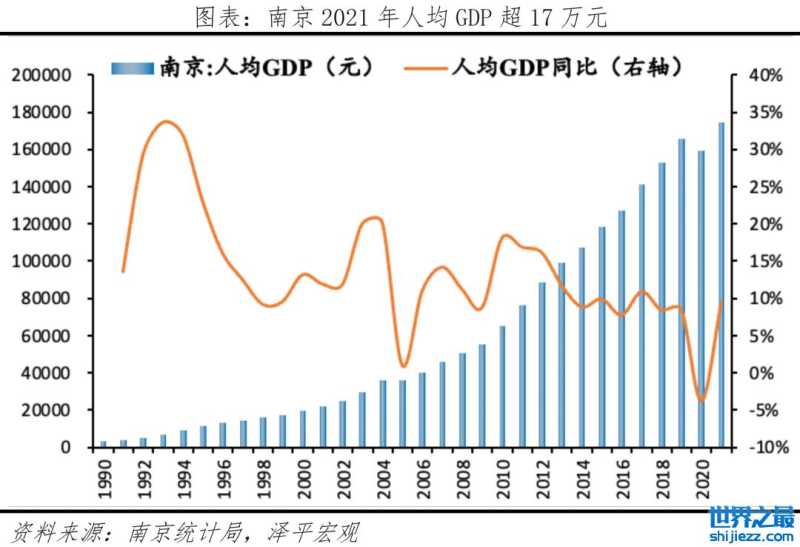因地理和历史因素,南京是江苏和安徽之间的纽带,2021年人均GDP位居十大城市第四。南京有着2400多年建城史,曾是六朝古都,历史上长期是中国南方的政治、经济、文化中心。从地理位置上来看,作为江苏省会,南京并未处于中心位置。南京主要辖区直接与安徽接壤,自南往北依次是宣城、马鞍山、滁州,不少安徽人来到南京就业。南京对安徽东部影响力巨大,已经超过了安徽省的省会合肥。事实上,古时江南省由江苏和安徽所组成,当时南京是江苏、安徽共同的首府。在历史和地理因素的作用下,南京始终是江苏和安徽两省之间的一个纽带。