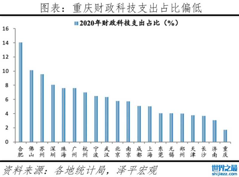 重庆仍面临科技创新实力不强的问题。一方面,尽管目前重庆有几十所高校,但大部分为职业院校,一流的理工类学校屈指可数,人才输送不足。另一方面,近年来,重庆先后启动了人工智能、大数据云计算、智慧城市技术创新与应用等重点专项,投入经费近5.7亿元,成效初显,但与沿海发达地区相比仍有差距。从全年研究与试验(R&D)经费支出占GDP比重看,重庆为2.1%,小于苏州的3.7%、杭州的3.6%、成都的3.1%。从财政科技支出占比看,重庆为1.7%,小于苏州的9.6%、杭州的7%、武汉的6.3%、成都的5.8%、南京的5.8%。