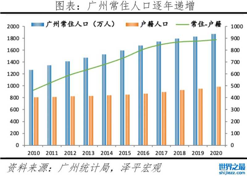 2021年广州GDP约2.8万亿,全国第四;人均GDP约13.4万元,十大城市中排名第7。人口方面,广州近十年常住人口年均增量近60万,全国第二,仅低于深圳;教育方面,广州有广东省超50%的高校,在校大学生总数超130万人,数量居全国第一。