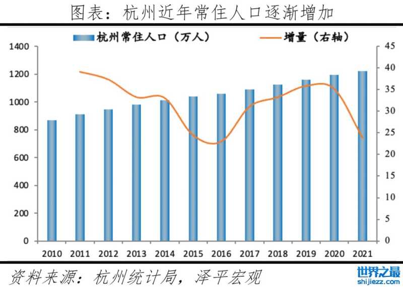 杭州经济发展势头良好,近五年常住人口年均增量长三角第一。“东南形胜,三吴都会,钱塘自古繁华”,历史上的杭州得益于京杭运河和通商口岸的便利,以及自身发达的丝绸和粮食产业,成为重要的商业集散中心。改革开放后,依托铁路以及上海在进出后贸易方面的带动,杭州轻工业发展迅速,民营经济活跃。2000年杭州开始大规模城市改造,大量资金流向杭州,推升杭州房价步入全国第一梯队。但由于杭州房价上涨过快,加之2008年金融危机影响,杭州房价一直阴跌至2015年低谷。随着阿里巴巴、网易等高科技企业的带动,互联网经济成为杭州新的经济增长点。2016年G20峰会后,杭州的国际化水平和影响力大幅提升。2016-2021年,杭州经济增长超60%,位列十大城市第二,近小幅低于成都。2021年杭州GDP达1.8万亿;城镇居民人均可支配收入7.5万,全国第4,绝对购买能力强。从上市公司数量看,A+H股上市公司杭州有189个,全国第四,仅低于北上深。近五年杭州常住人口年均增量为长三角第一。