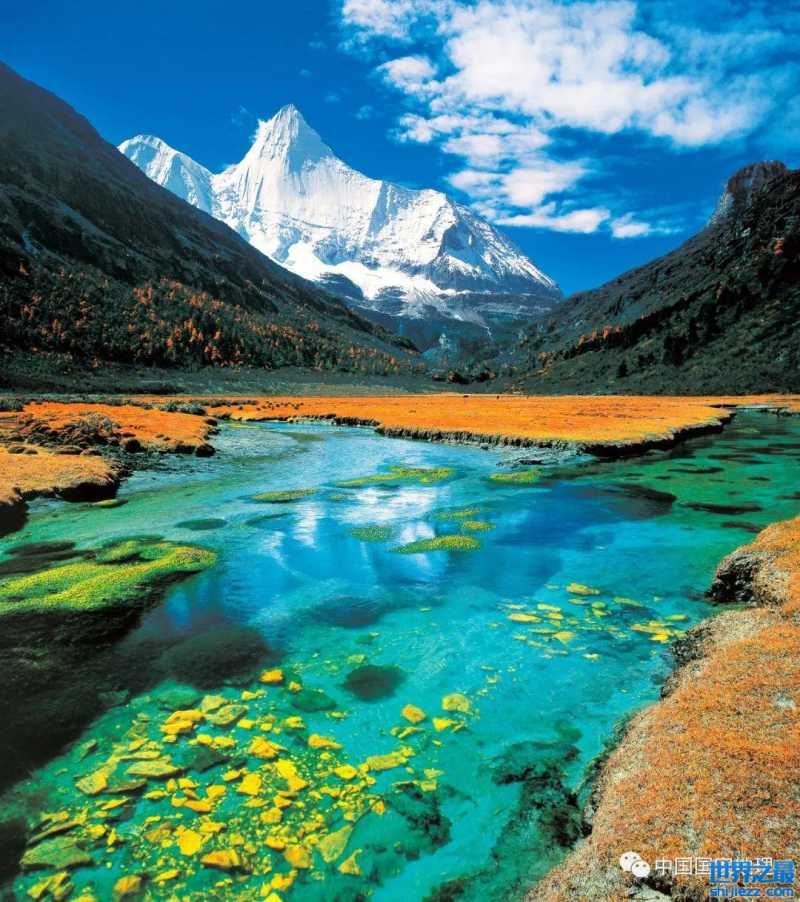 位于三座雪峰之间的洛绒牛场。溪流呈现出梦幻般的色彩,秋天来临了,草地失去了野花和绿色,但雪山还是那样洁白,流水还是那样碧绿,草地、溪流、雪峰构成了在我国东部地区绝不会见到风景。摄影/吕玲珑