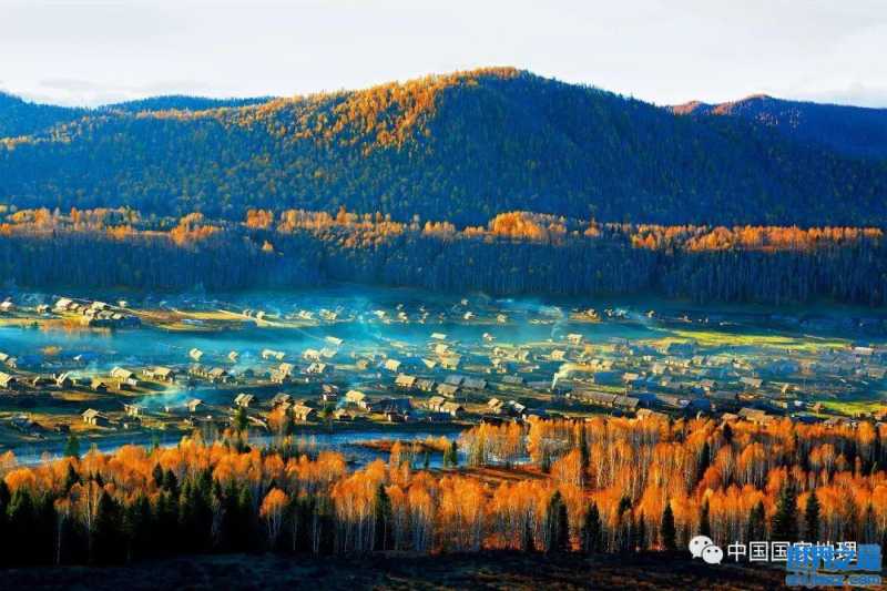 禾木村位于喀纳斯河与禾木河交汇处的禾木草原中,这个居住着图瓦人的边陲小村庄,因为其美丽的秋色成了喀纳斯景区的重要组成部分,吸引了众多的游人和摄影爱好者。阳光照射着桦树林和山谷间的盆地,木楞房上炊烟升起。与夏季的景致不同,秋天的杨、桦树叶即将飘落枯萎,这时的禾木村灿烂而凄美,意境如古老的西方油画。摄影/刘新海