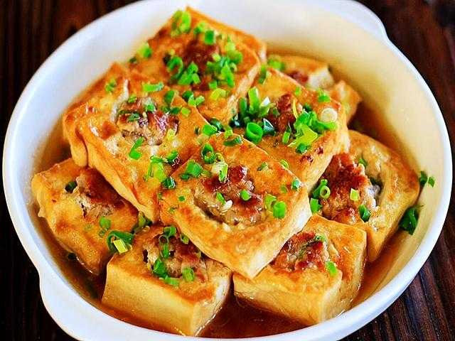 这是滁州市凤阳县的一道特色名菜,同时也是一道特色小吃。酿是制作花色菜肴的技法之一,是将肉和其他配料塞进蔬菜、豆腐或者其它东西中,再进行蒸或者煎的烹饪手法。滁州的酿豆腐质地软嫩,颜色金黄,外脆里嫩,鲜香味美,深受人们喜爱。