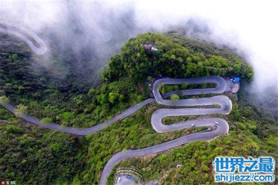 天门山盘山公路是有着“通天大道”之称的传奇公路。它全长10.77公里,沿途共计99个弯道,而其中有很多弯道都是180度转弯。远远望去,天门山盘山公路的路段宛如一条条玉带盘绕在翠绿的山体周围,看上去仙气缭绕,美不胜收。
