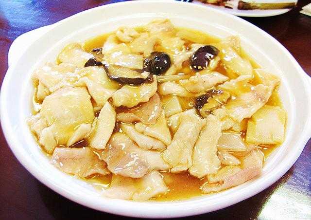 扒原壳鲍鱼是山东青岛的传统名菜。鲍鱼是海鲜里的珍品,对于一个爱吃海鲜的城市来说,自然是要把鲍鱼吃出特色的。这道菜是先把鲍鱼的肉挖出来烧制成熟,然后又塞回各自的壳里,剩下的汤汁用淀粉勾芡浇在鲍鱼上面,最后再淋上些许鸡油即可。吃起来肉质细嫩、味道鲜美。