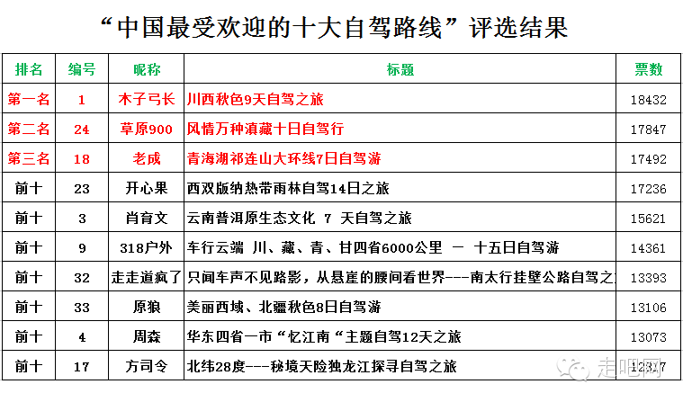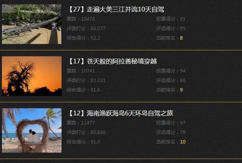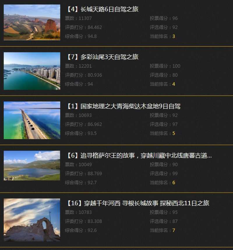 注:网友票选时间为15天,专家评委评选结果在票选倒计时前5天公布以便为网友票选白热化加一把火。专家评委由30人组成,成员由业内专家、旅行达人、旅媒记者、自驾达人、资深吧粉等(以个人身份)组成。