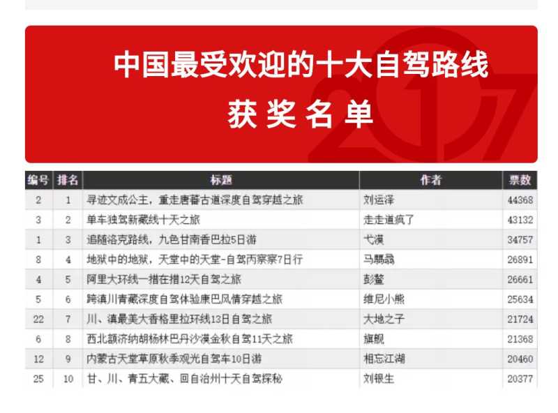 5、入选“中国最受欢迎的十大自驾路线”获奖选手全程免费(每条获奖路线仅限1人)参加在西藏阿里举行的颁奖典礼及承办地西藏阿里落地自驾体验活动。