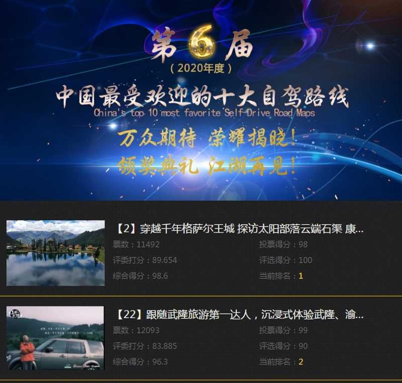 2、2023年2月28日12时正式启动公开投票环节,由投票系统即时统计得票;参选自驾路线得分(专家评委分30%+网友投票分70%)最高的前10名获奖;