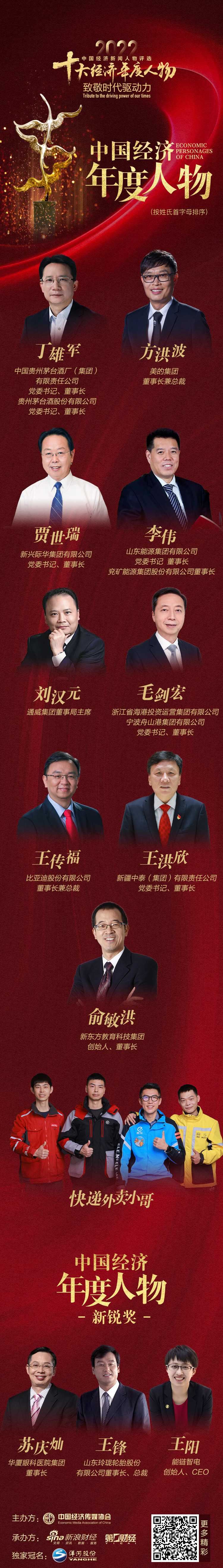 新东方教育科技集团创始人、董事长俞敏洪;中国贵州茅台酒厂(集团)有限责任公司党委书记、董事长,贵州茅台酒股份有限公司党委书记、董事长丁雄军;新疆中泰(集团)有限责任公司党委书记、董事长王洪欣;浙江省海港投资运营集团有限公司、宁波舟山港集团有限公司党委书记、董事长毛剑宏;通威集团董事局主席刘汉元;美的集团董事长兼总裁方洪波;新兴际华集团有限公司党委书记、董事长贾世瑞;山东能源集团有限公司党委书记、董事长,兖矿能源集团股份有限公司董事长李伟;比亚迪股份有限公司董事长兼总裁王传福当选“2022中国经济年度人物”。同时,还有四位快递外卖小哥作为代表,荣获了“2022中国经济年度人物特别奖”。此外,华厦眼科医院集团董事长苏庆灿,山东玲珑轮胎股份有限公司董事长、总裁王锋,能链联合创始人、能链控股总裁,能链智电创始人、CEO 王阳获得“2022中国经济年度人物新锐奖”。