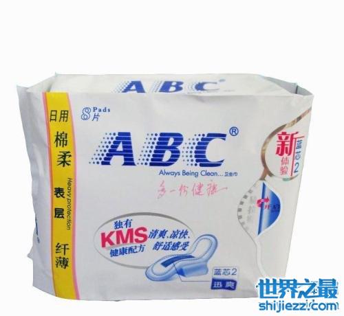 ABC是来自广东佛山的景山卫生有限公司,是中国最著名的国产卫生巾品牌之一,它的翻译师永远追求干净、清洁。深受中国女同胞的喜爱。他独创的超强吸收和夜间防侧漏技术成为一道响亮的招牌。