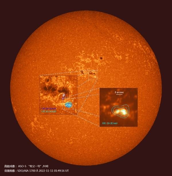 HXI在2022年11月11日“双11”观测到的一个C级耀斑硬X射线成像与AIASDO紫外1700图像的比较(图片来源于网络)