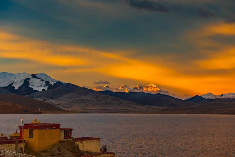 推村还有一处看风景视角极佳的地方,你一定猜不到,那就是推村唯一的公厕。厕所的高台直面绝美的普姆雍措湖,连绵的雪山在云层下若隐若现,傍晚的天空似有金光洒落湖面,绝美。