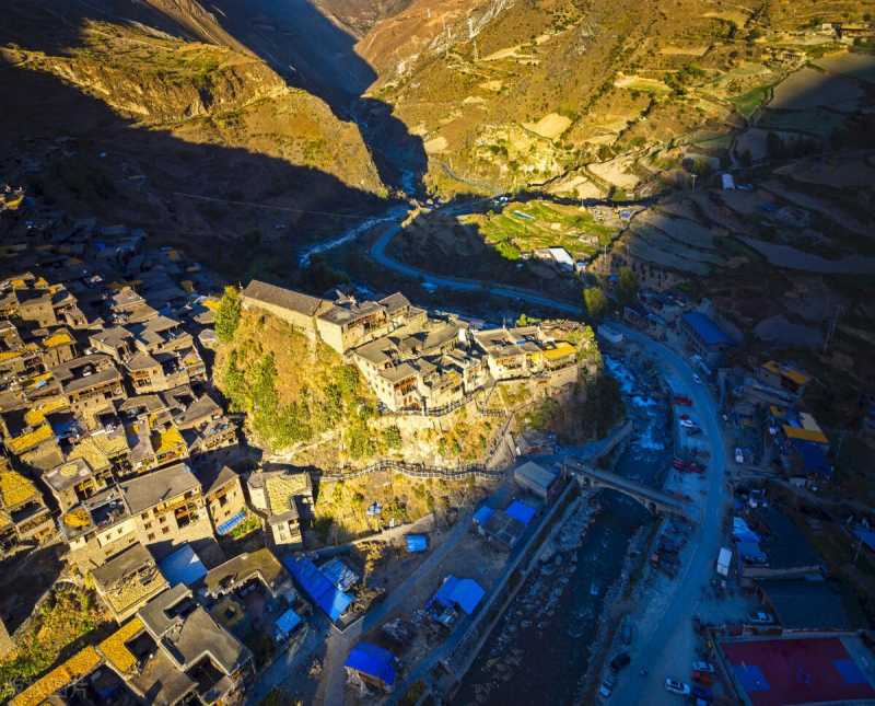 村子一家挨着一家,一户靠着一户,彼此相连,相邻的院墙都有一根独木梯,你家的房顶就是我家的后院,从一户人家走进去,可走遍全村。房屋间留有可供人畜通行的通道。