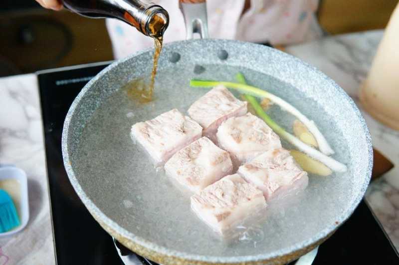 1、整块五花肉,形状最好是长方形或者正方形的,放在锅内焯水,皮朝上放置,水开后大概两三分钟后捞出沥干水分,炒一些糖色备用。