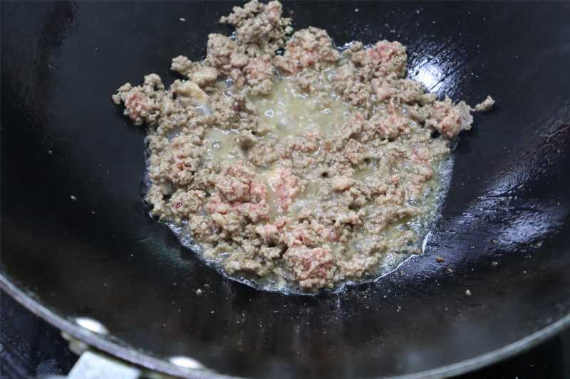 4、锅中放菜籽油,没有的可以用花生油代替,油要稍微多一些,加入牛肉碎放入炒到酥香,炒的时间要长一些。