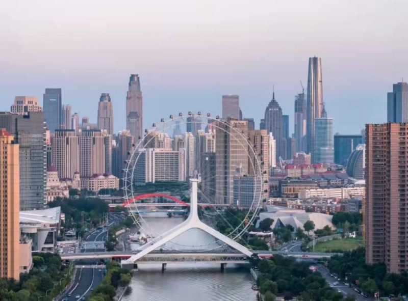 天津之眼是世界上唯一一个桥上瞰景摩天轮,是天津的地标之一。摩天轮直径为110米,轮外装挂48个360度透明座舱,每个座舱可乘坐8个人,可同时供384个人观光。摩天轮旋转一周所需时间为28分钟,到达最高处时,周边景色一览无余,甚至能看到方圆40公里以内的景致,被誉为“天津之眼”。
