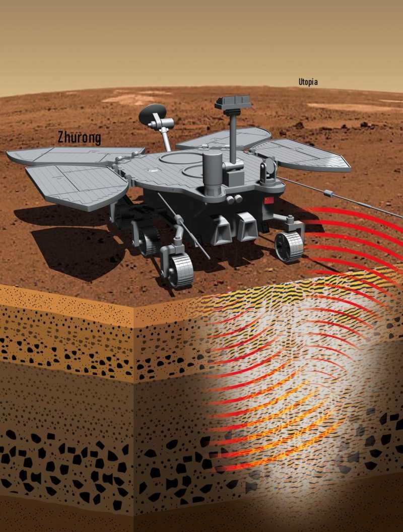 祝融号火星车在乌托邦平原进行原位雷达探测,首次揭示了乌托邦平原浅表精细分层结构(图片设计:中科院地质与地球所研究团队;图片绘制:武汉大学邓俊)