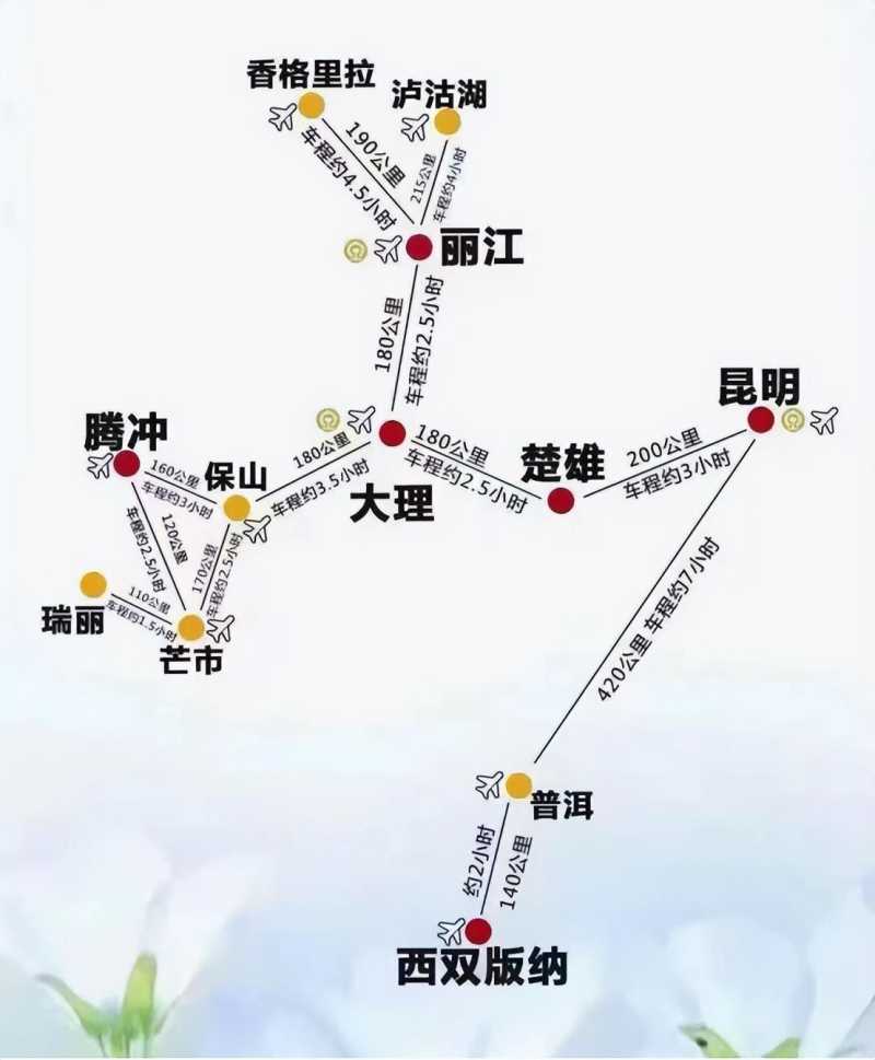 线路里程:双廊古镇--382公里--腾冲热海--12公里--和顺古镇,全程共394公里。