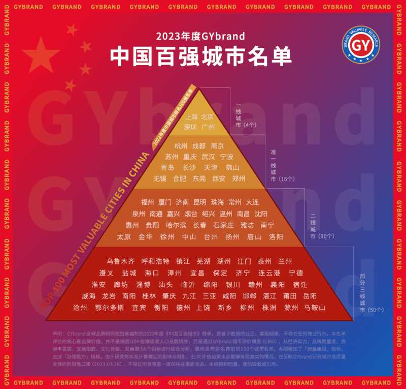 这是GYbrand全面展示中国城市高质量发展情况的榜单,并不是简单按照城市GDP或者人口规模排序,而是从经济实力、质量建设、商业资源、文化体验、居住生活、发展潜力等六大指标进行综合评价,最终发布2023中国城市排名100强名单。