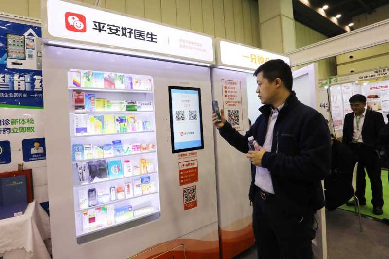 在河南郑州的医疗行业展会上,一名参观者体验平安好医生的一分钟诊断。