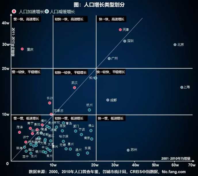 数据说话,在人口增速上,京沪广深四大金刚当之无愧是王者,尽管它们人口增速放缓,但其增量依然非常可观。天津和成都的人口增速表现抢眼,其中天津在2001-2017年间人口均加速增长,成都在20世纪初的10年间人口增速不俗,但2010年后放缓不少。总体来看,京沪广深的地位几乎无法撼动,天津潜力最大,成都次之。