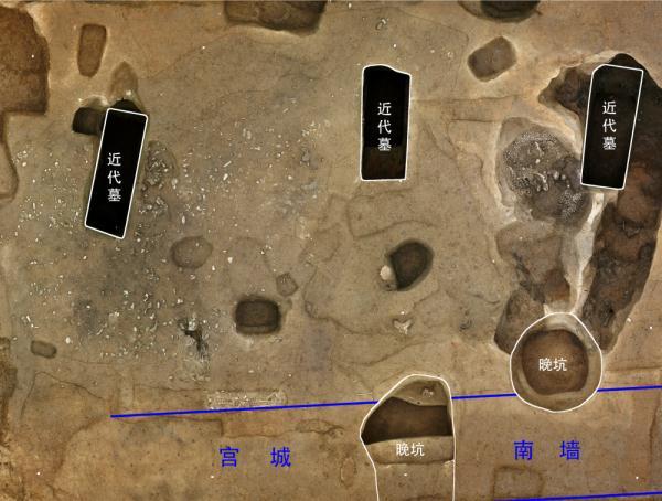 考古队最先在“井”字形道路西南路口发现宽约18米的南北和东西走向的两条道路,且继续向南、向西延伸,随后不断有新的墙垣被发现,确证了宫城和作坊区之外的其他区域外侧有围墙。